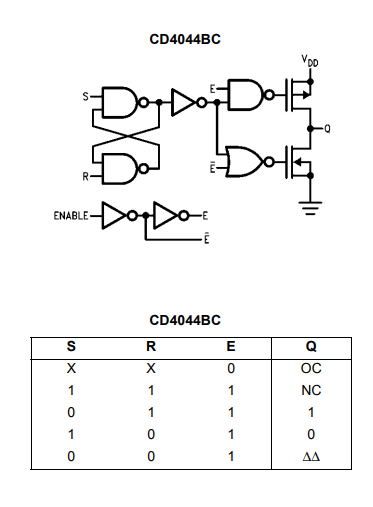 آی سی CD4044 دارای 4 عدد لچ سه مرحله ای ساخته شده با استفاده از فلیپ فلاپ نوع S-R با گیت NAND می باشد. فلیپ فلاپ SR یک المان فیزیکی است که می تواند به عنوان یک عنصر تاخیر دهنده به کار گرفته شود. این المان فیزیکی دارای دو ورودی به نام های R و S می باشد و دو خروجی دارد که یکی متمم دیگری است. این آی سی شامل 8 ورودی و 4 خروجی است که خروجی ها بر اساس حالت ورودی تعیین می شود. برای مشاهده جدول درستی و بلوک دیاگرام آی سی CD4044 به تصویر زیر مراجعه کنید: