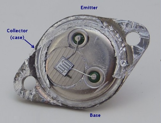 شاید برای شما جالب باشد که درون ترانزیستور قابلمه ای 2N3055 چیست , همانطور که در عکس زیر مشخص است درون ترانزیستور 2N3055 یک چیپ بوده که با دو سیم به دو پایه ترانزیستور متصل شده است.